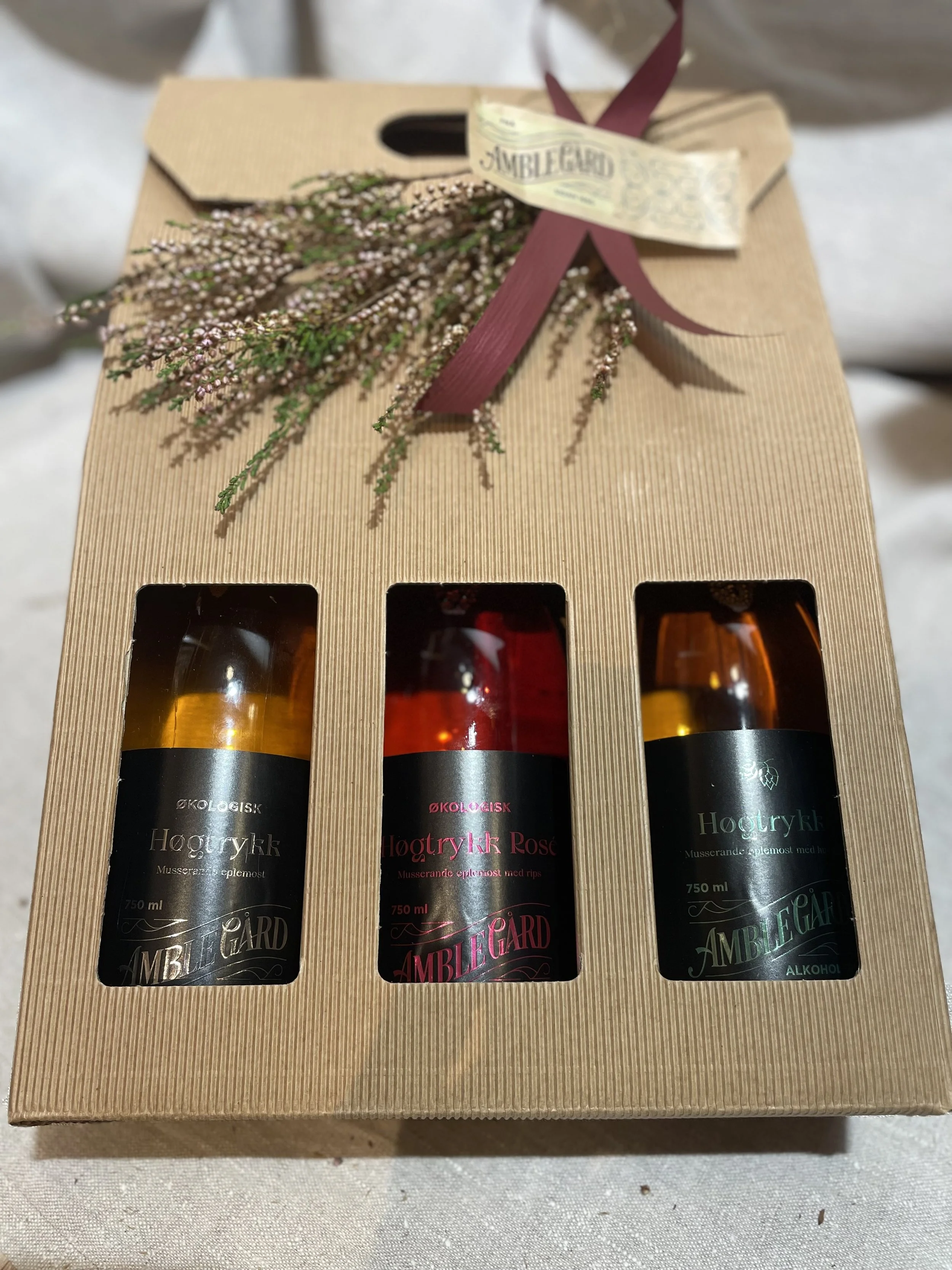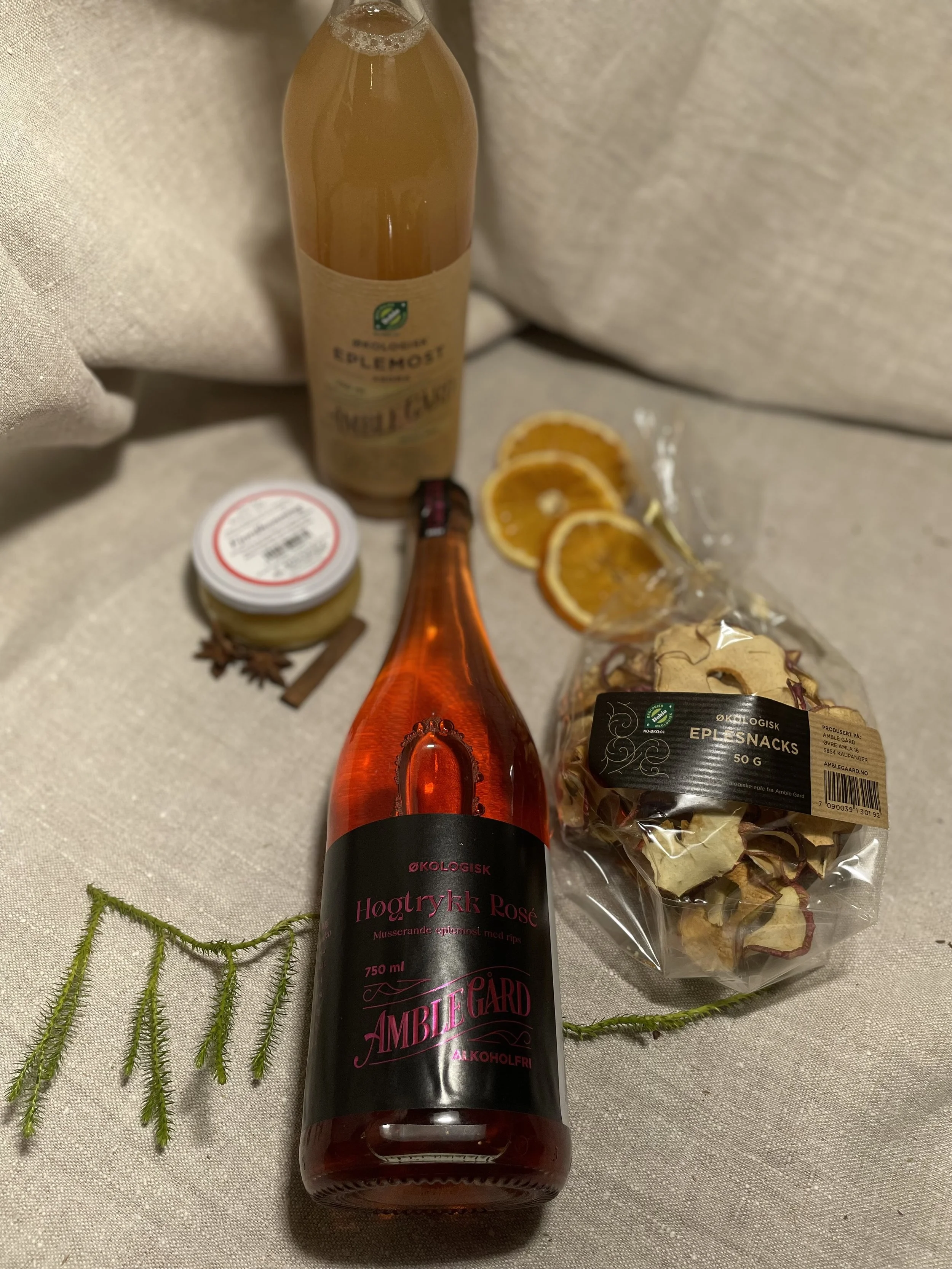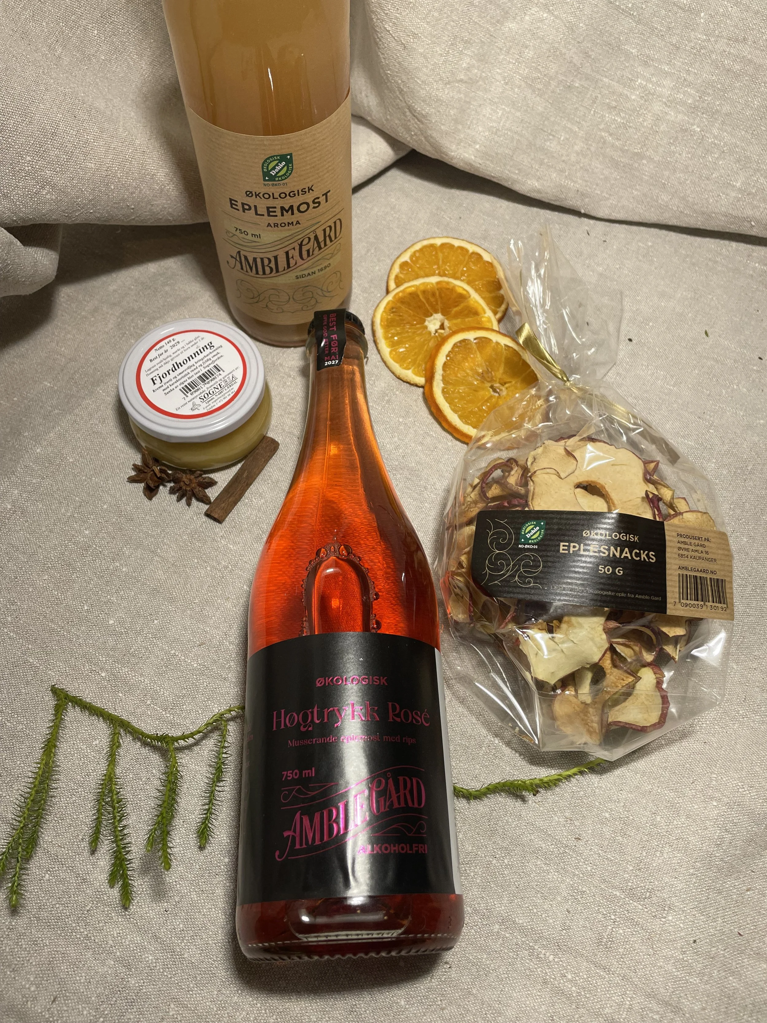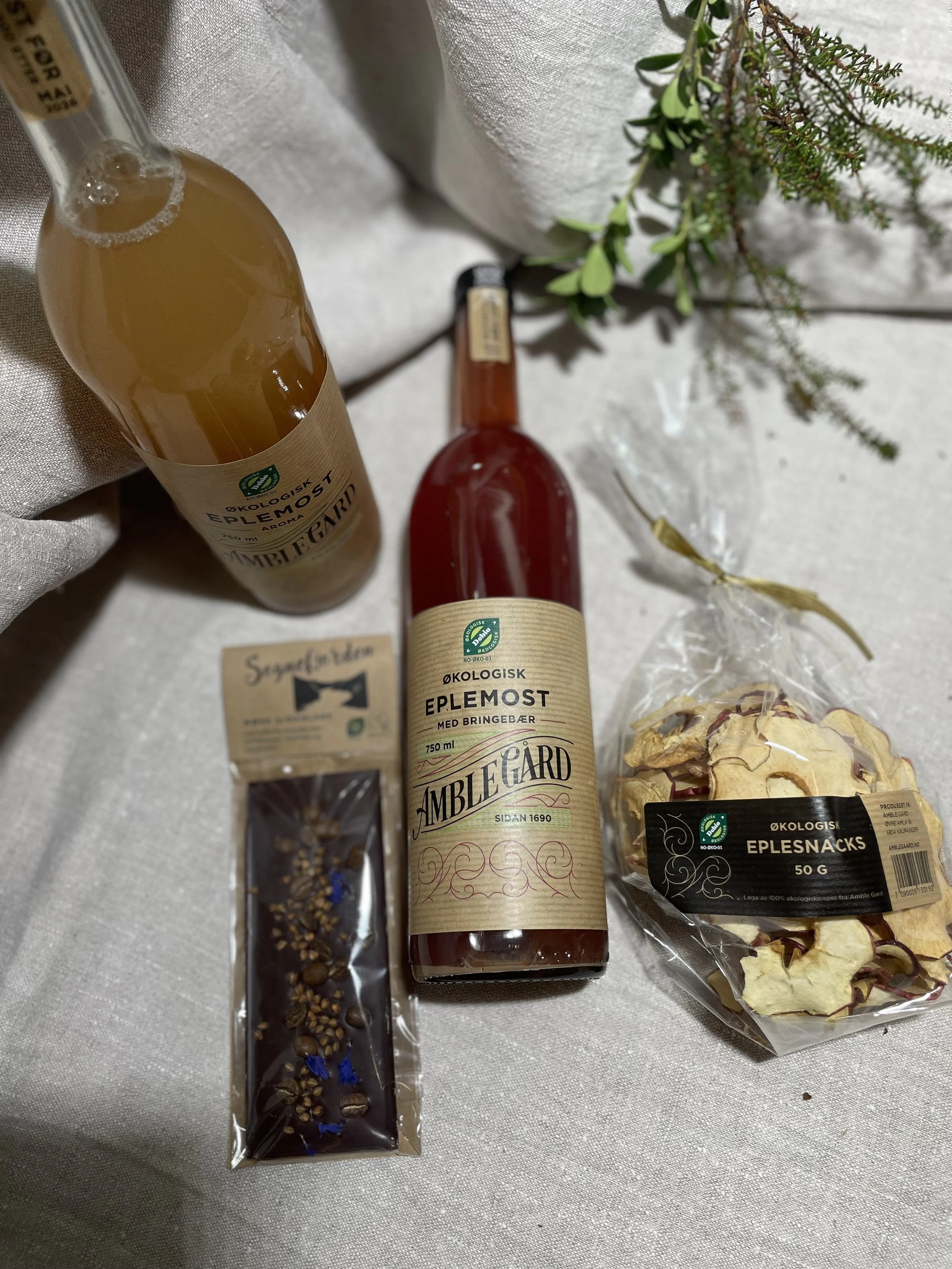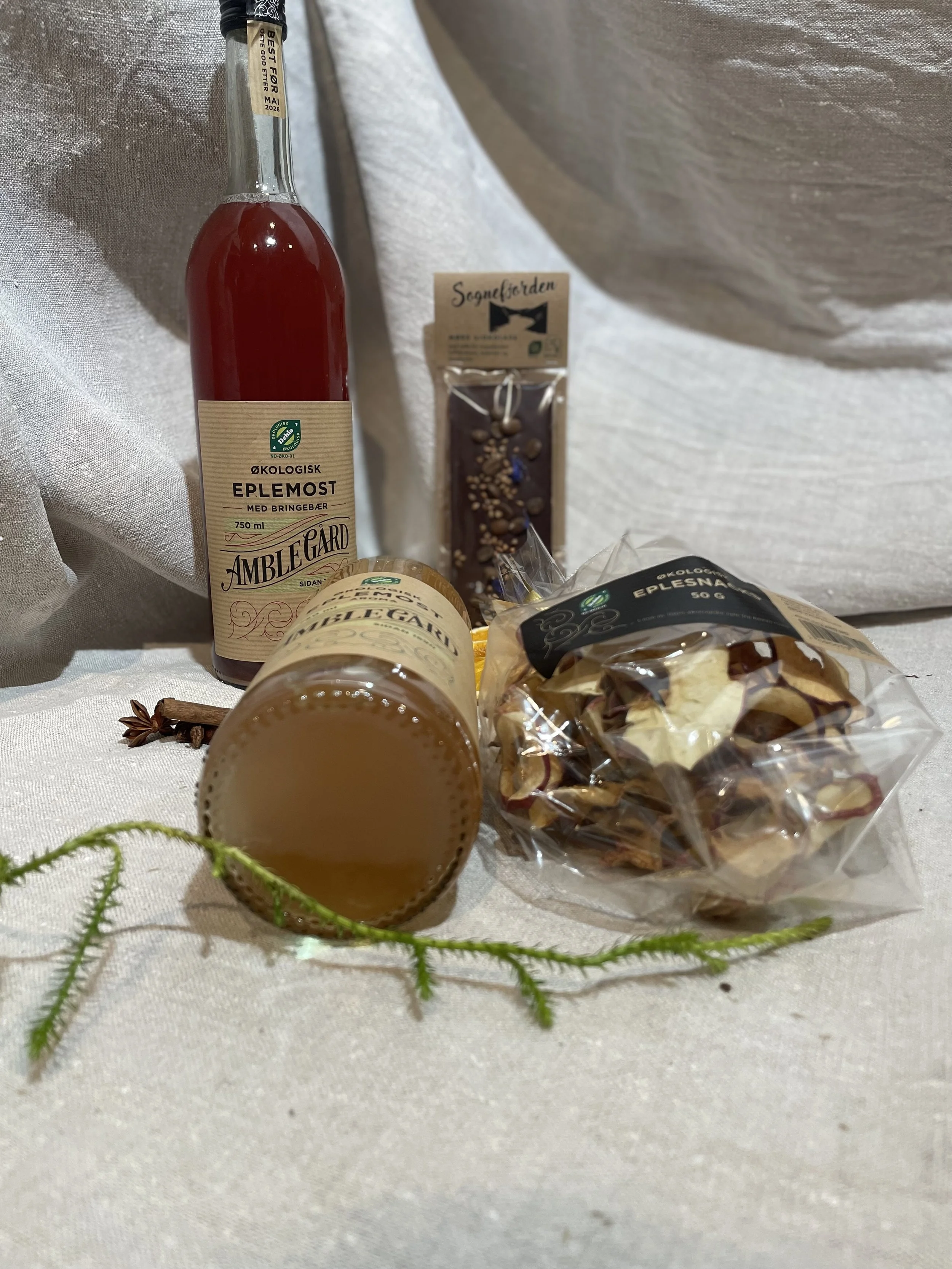 2 små flasker eplemost 0,33, 1 glass syltetøy og 1 liten pose eplesnack. Gavekurven i papp er pakket i cellofan med gavebånd og klistremerke